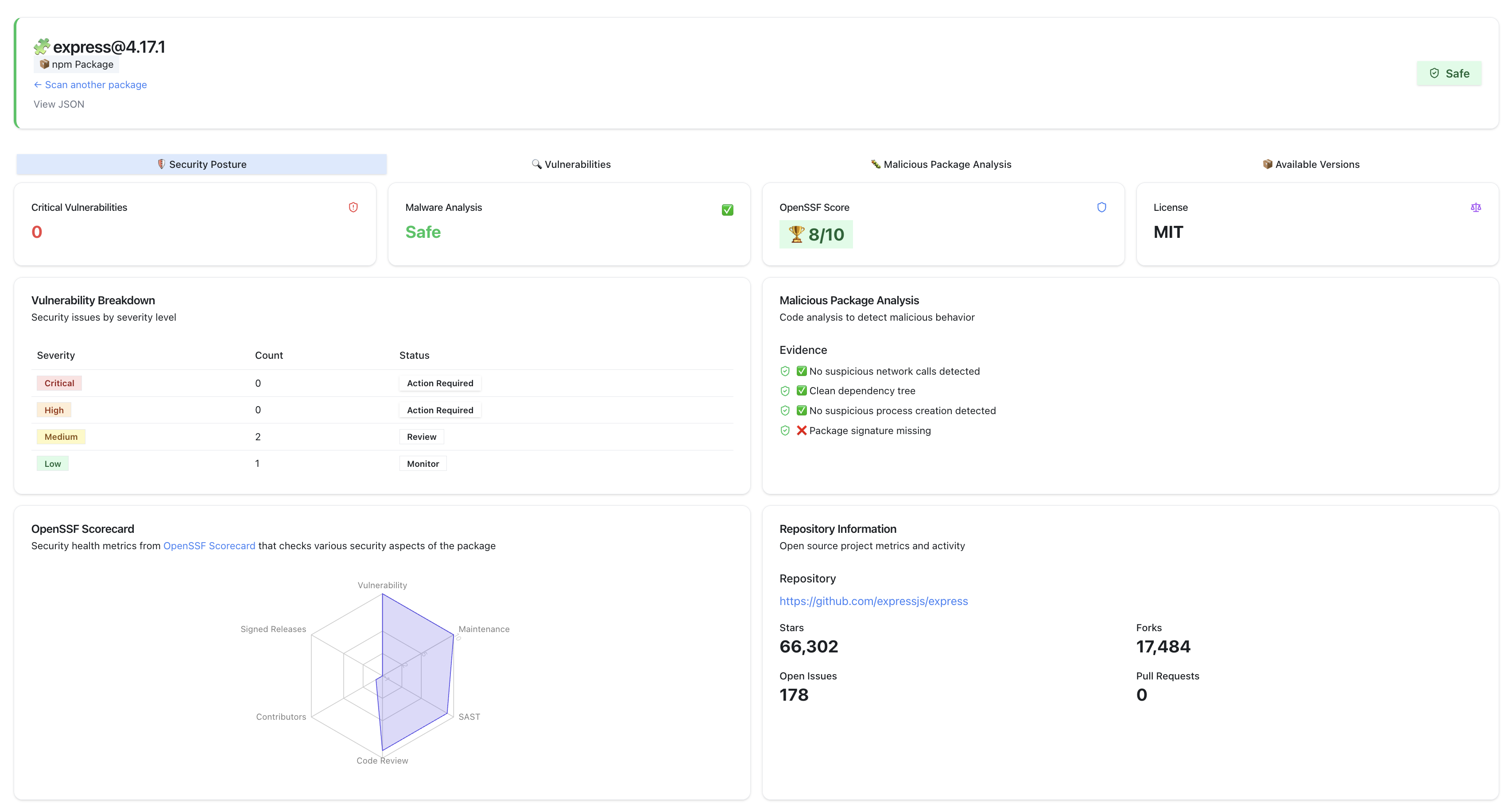 vetpkg.dev is a free service that provides visibility into the security of open source components. It is built using the SafeDep Cloud API to provide an easy to use interface for developers to check the security of their open source dependencies before using them in their projects.