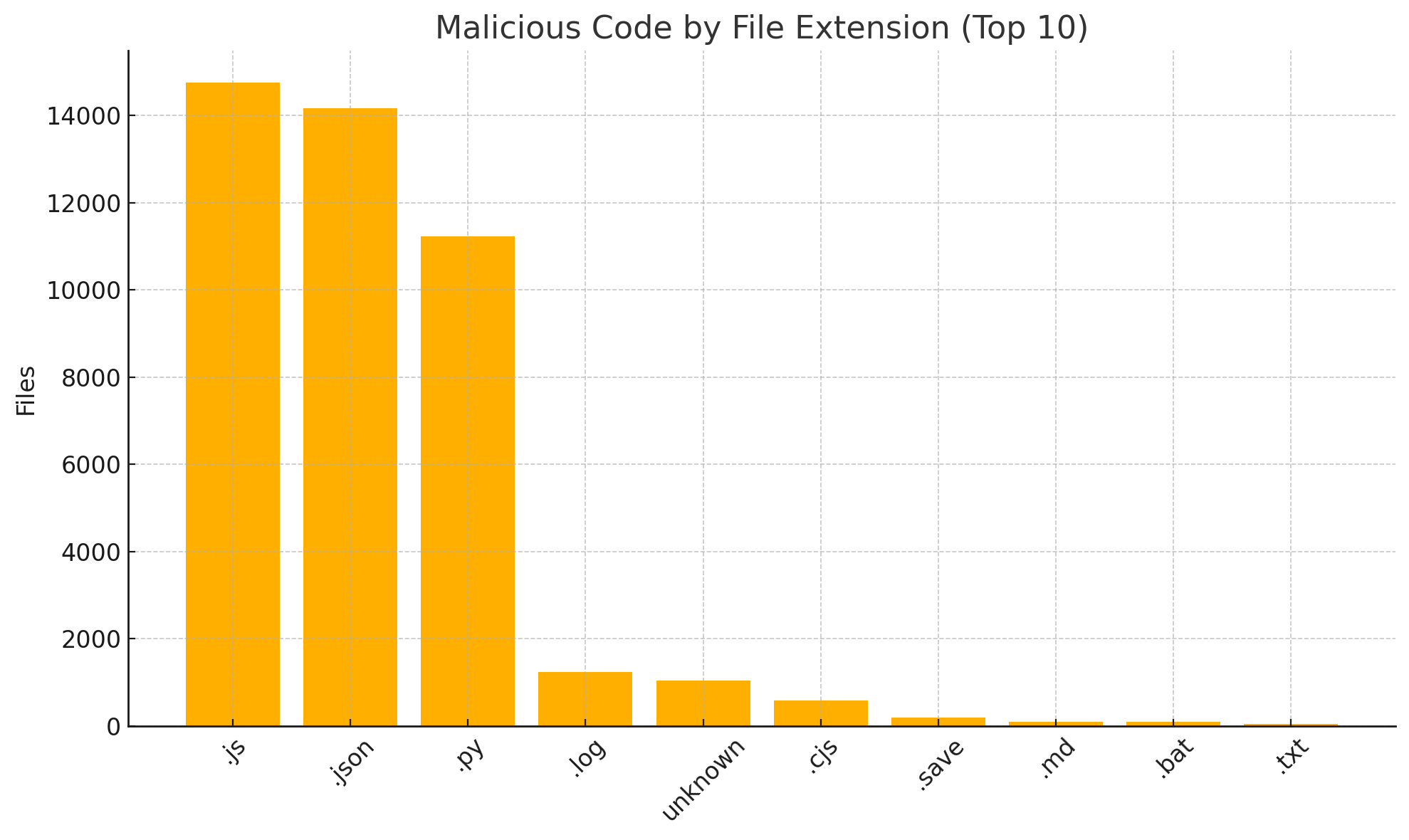 The distribution of file extensions that contributed to evidence (signals) based on which a package was classified as malicious are shown below.
