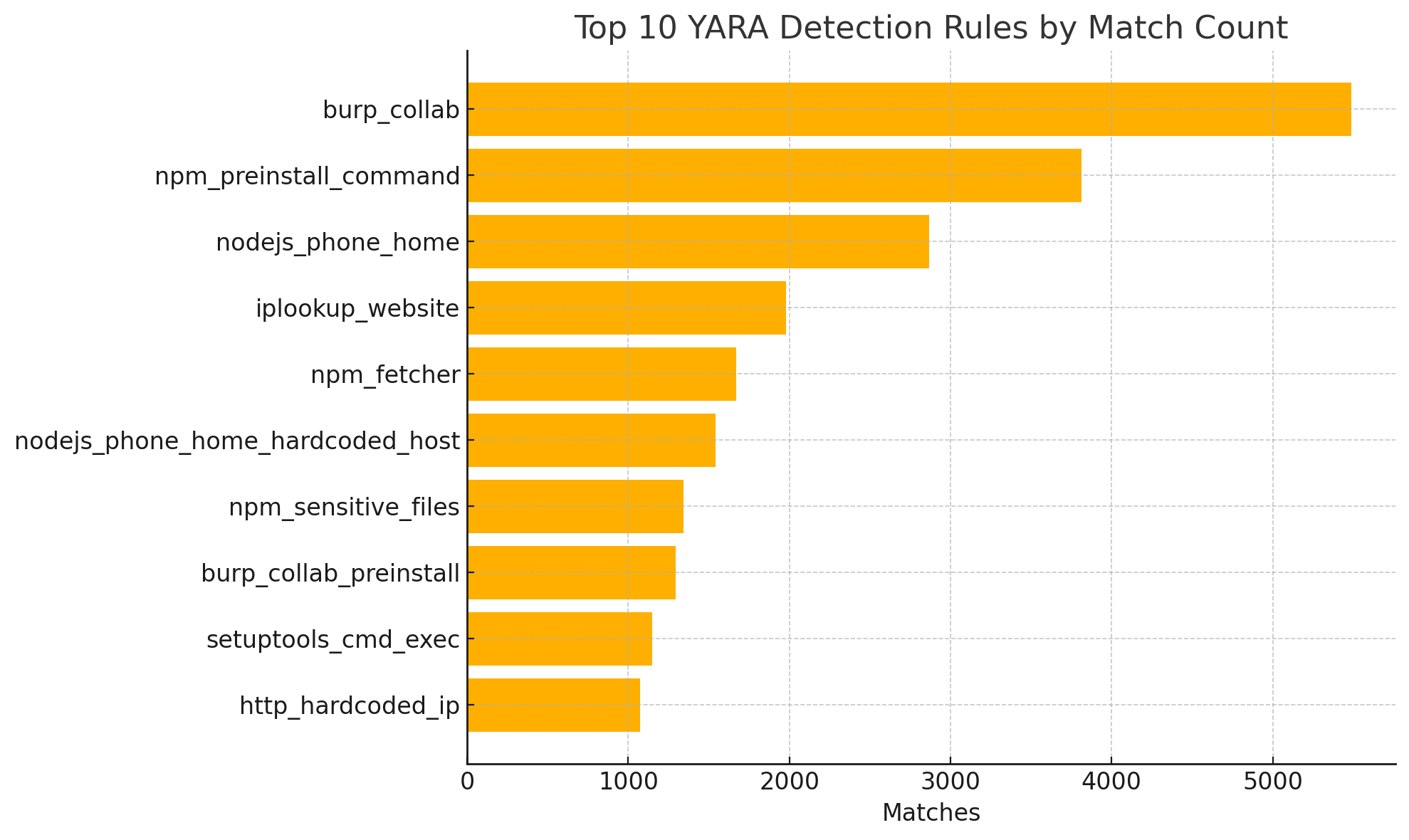 The Top 10 YARA rules that matched > 75% of the malicious packages are shown below. The rules were curated from the YARA Forge project. This is an indicator of most common TTPs used by malicious actors.