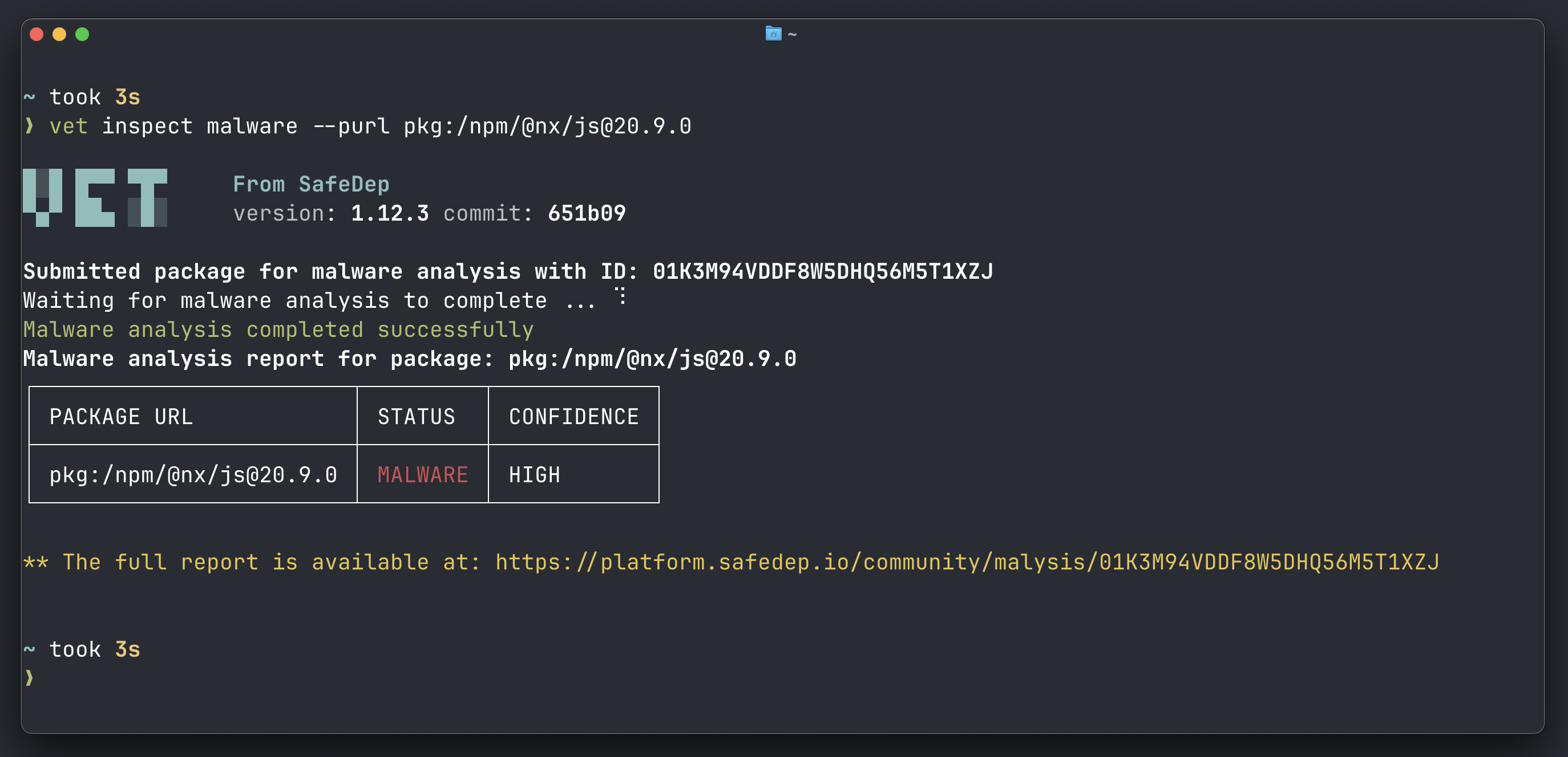 vet inspect malware --purl pkg:/npm/@nx/js@20.9.0